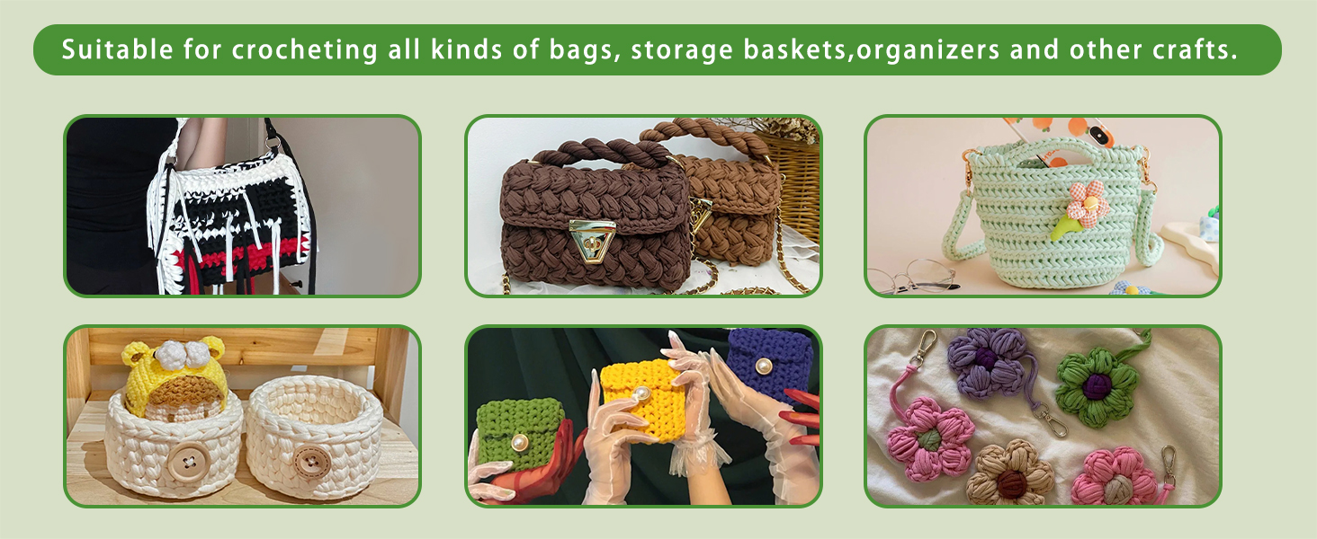 - Wide Applications: T-shirt fabric yarn is suitable for a wide range of creative projects, including bags (tote bags, shopping bags, wallets), baskets, rugs, and pet mats. Crochet tshirt Yarn’s ease of use makes it an excellent choice for various DIY crafts, ensuring that your creations are both functional and stylish.